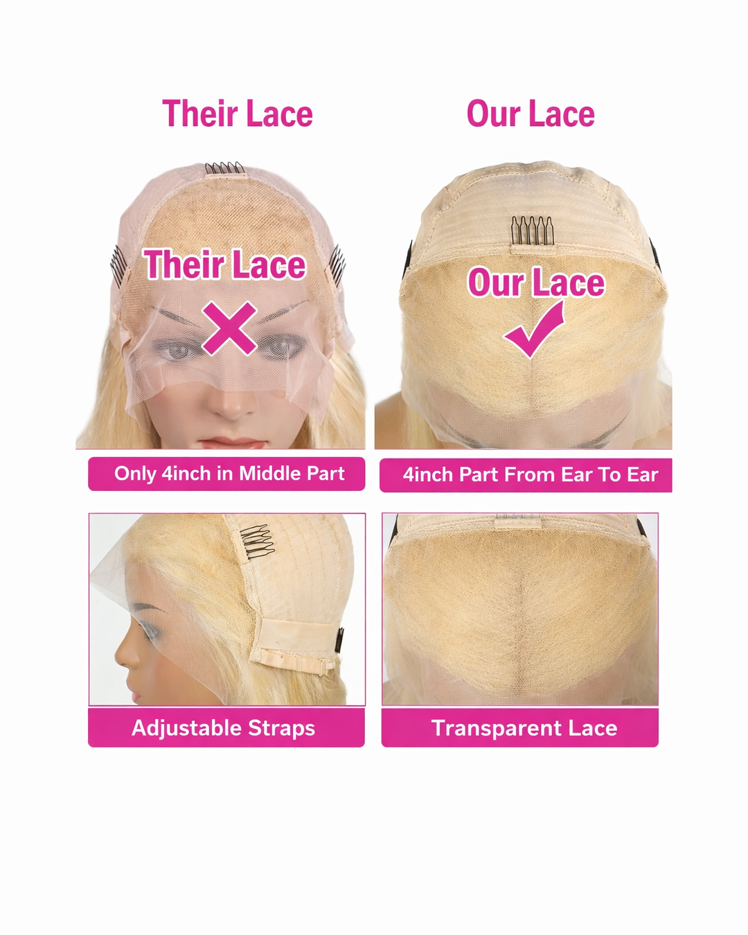 La bordure frontale en dentelle transparente se fond avec les teints clairs, offrant une ligne de cheveux naturelle et un espace généreux pour une raie au milieu ou sur le côté, tandis que sa texture lisse contribue à minimiser les frottements contre la peau.